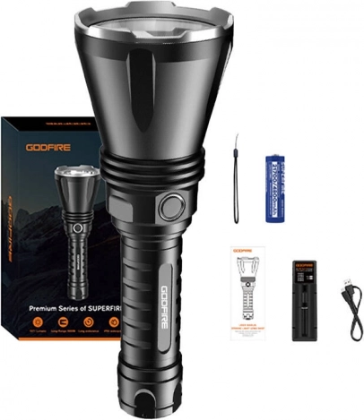 Flashlight Superfire Godfire TF01 is a quality device for reliable and efficient lighting in various conditions. It offers a range of up to 1,000 meters in turbo mode and different brightness levels thanks to its large capacity 4800 mAh battery for long-term use.