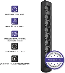 Looking for a universal solution to power multiple devices from a single socket? This surge-protected strip combines safety, ergonomics, and design. With 8 outlets, you can easily connect your TV, PC, chargers, and kitchen appliances, while the 1.8 m cable gives you ample reach.