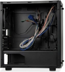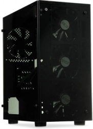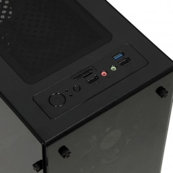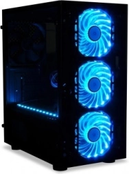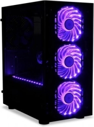 A chassis built for gamers. The power supply is mounted at the bottom in a dedicated shroud that separates it from the rest of the case. The case is also equipped with a set of magnetically attached dust filters that limit dust entering the interior. The front panel provides one USB 3.0 port and two USB 2.0 ports. The chassis is black. Three illuminated 120 mm RGB fans are installed at the front, and one 120 mm RGB fan is installed at the rear.