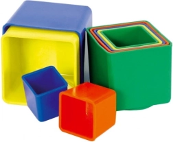 Nine colorful plastic cubes for little ones support the development of fine motor skills, logical thinking, and hand–eye coordination. The hollow cubes can be stacked into a tower or nested inside one another; the largest measures 9 × 9 × 9 cm. Suitable from 1 year, made in the Czech Republic. Colorway supplied in a mix of colors depending on stock availability.
