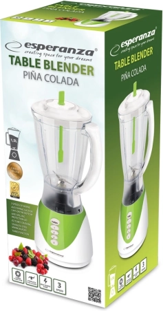 Esperanza Pina Colada countertop blender, 350 W, 1.5 L, 3 speeds, Turbo, stainless steel blades, ice crushing. Stable suction feet and dishwasher-safe parts. Green design.