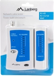Universal LAN and telephone line cable tester by LANBERG for quick diagnostics and wiring verification. It checks conductor continuity, detects short circuits, open wires, miswiring, and crossed/reversed pairs. Supports RJ-45, RJ-12/RJ-11, and coaxial connectors and offers two test speed modes with clear LED indication.