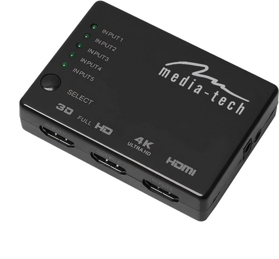 A compact 5-port HDMI switch from MEDIA-TECH lets you connect up to five devices to a single TV or monitor and easily switch between them. It supports 4K Ultra HD, Full HD, 3D video, and 12-bit color depth, and handles advanced audio formats like DTS‑HD and Dolby TrueHD. Installation is Plug & Play with no drivers, and switching is possible via the on-device button or the remote control.