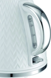 A modern white kettle with a diamond pattern, metal handle, and chrome details will be a highlight of any kitchen.