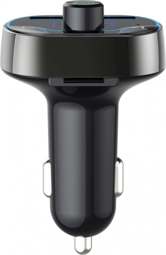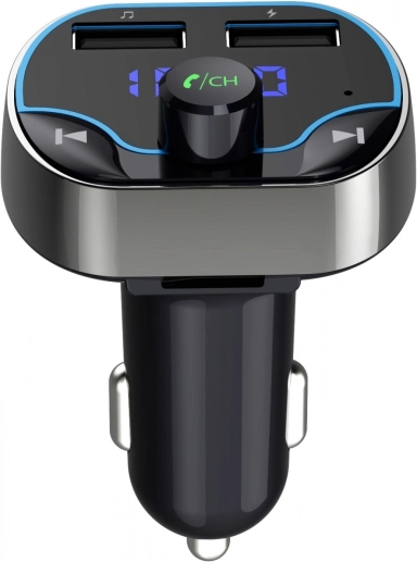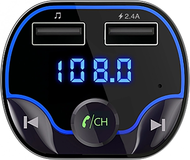 The device features two USB ports for simultaneous charging and music playback, an intuitive control wheel, and a bright LED display for easy frequency tuning. Its compact 12/24 V cigarette lighter design saves space and is compatible with most vehicles.