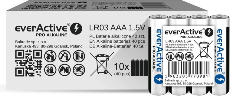 Reliable AAA alkaline batteries from everActive in the Pro Alkaline series for professional use. They offer capacity approx. 1250 mAh, long service life up to 10 years, and stable performance for demanding and everyday applications.