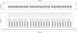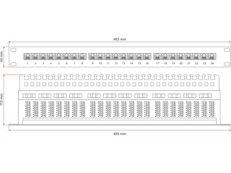Unshielded patch panel for telecommunications and data networks offering 24 ports with LSA/IDC termination, supports UTP Cat 5e and has a height of 1U. Thanks to the integrated shelf and a compensation circuit on the PCB, it is ideal for main and intermediate distribution points in environments without significant electromagnetic interference.