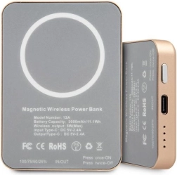 A stylish and compact gold power bank that enables wireless charging of compatible smartphones without the need for a cable. With its magnetic attachment, it stays firmly on your device, speeding up the charging process.