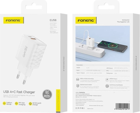 Foneng Charger EU56 is a powerful and fast charging solution thanks to GaN technology. It offers fast charging with a power of 20W and supports a range of fast charging protocols.