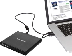 The VERBATIM external slim drive adds the ability to read and burn CDs and DVDs to your laptop at the office, at home, or on the go. Thanks to its slim design, it slips easily into a bag and connects with a single USB 2.0 cable—no external power needed.