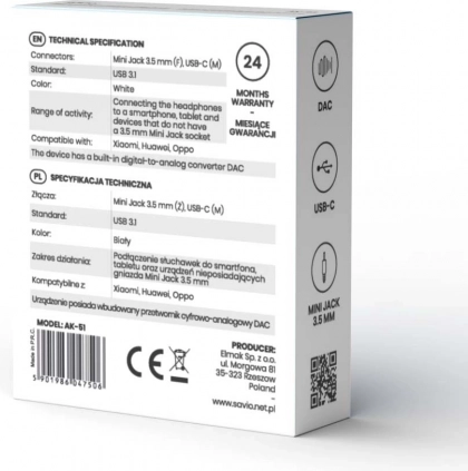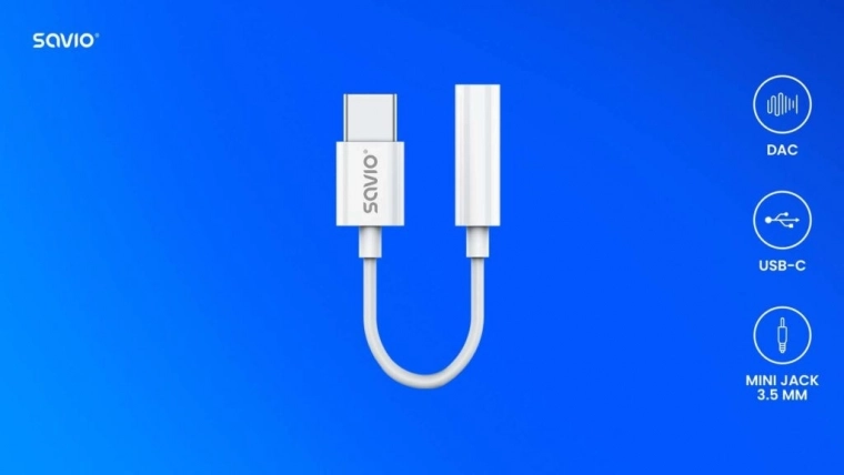 The compact USB‑C to 3.5 mm adapter from SAVIO lets you connect standard headphones and speakers to modern phones, tablets, and laptops without an audio jack. Thanks to the integrated DAC converter, it delivers clean, high-quality sound, is compatible with USB‑C devices, and is ideal for XIAOMI, HUAWEI, and OPPO.