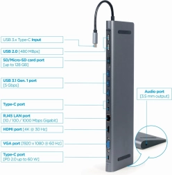 - 9-in-1 functions: USB hub, 4K HDMI and Full HD VGA, audio, gigabit LAN port, card reader, and USB Type-C PD charging port
