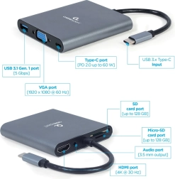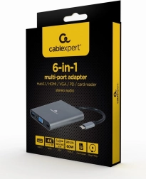 - 6 in 1: HDMI 4K, VGA FHD, USB 3.0, 3.5 mm audio, SD and microSD, USB‑C PD