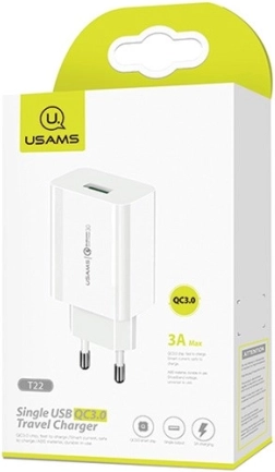 Discover the practical and safe USAMS T22 charger, made from fire-resistant ABS+PC material, ensuring durability and environmental friendliness. With this 18W charger, you have the opportunity for fast charging up to 3A.