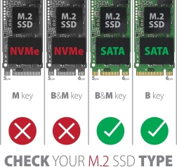 You can use M.2 drives with lengths of 42, 60, and 80 mm. The drives can be single-sided or double-sided, and there is no capacity limit on the SSD drive. The screwless opening of the case simplifies the installation and exchange process of the drives.