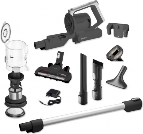 The set includes a special PET nozzle for pet hair, a SOFA nozzle (upholstery), crevice accessories, and an attachment for books and delicate surfaces. A wall mount makes it easy to store the vacuum and accessories, while battery overheat protection and a pre-motor filter extend the device’s lifespan.
