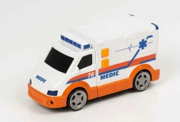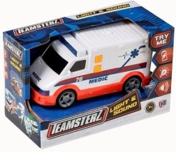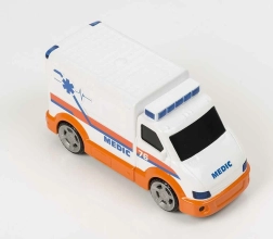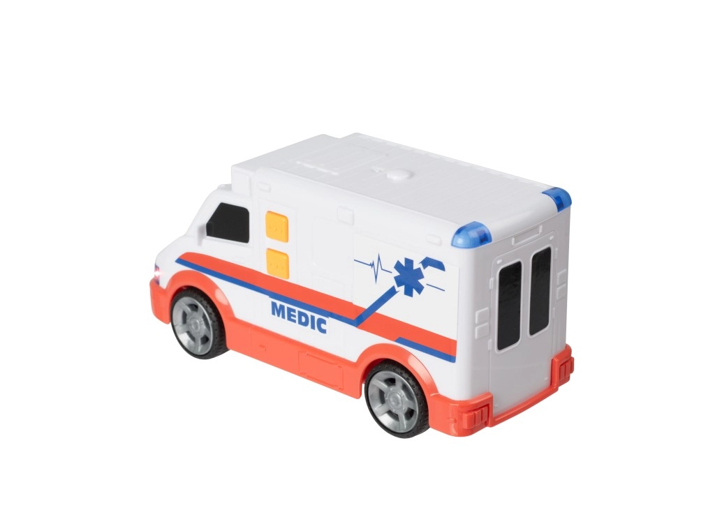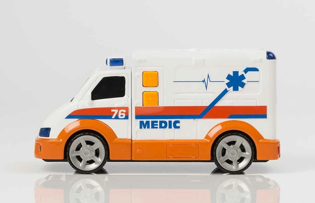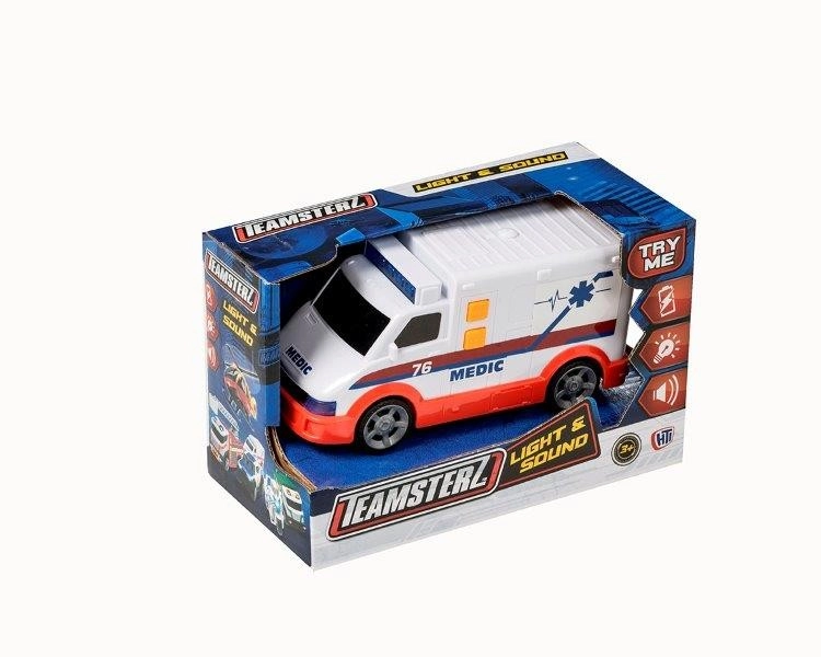 This finely detailed TEAMSTERZ ambulance brings children an authentic action experience. Press the button to light up the beacon and hear realistic sounds – engine start, dispatch to an emergency, and a siren during fast driving. The perfect toy for imaginative and role-play fun.