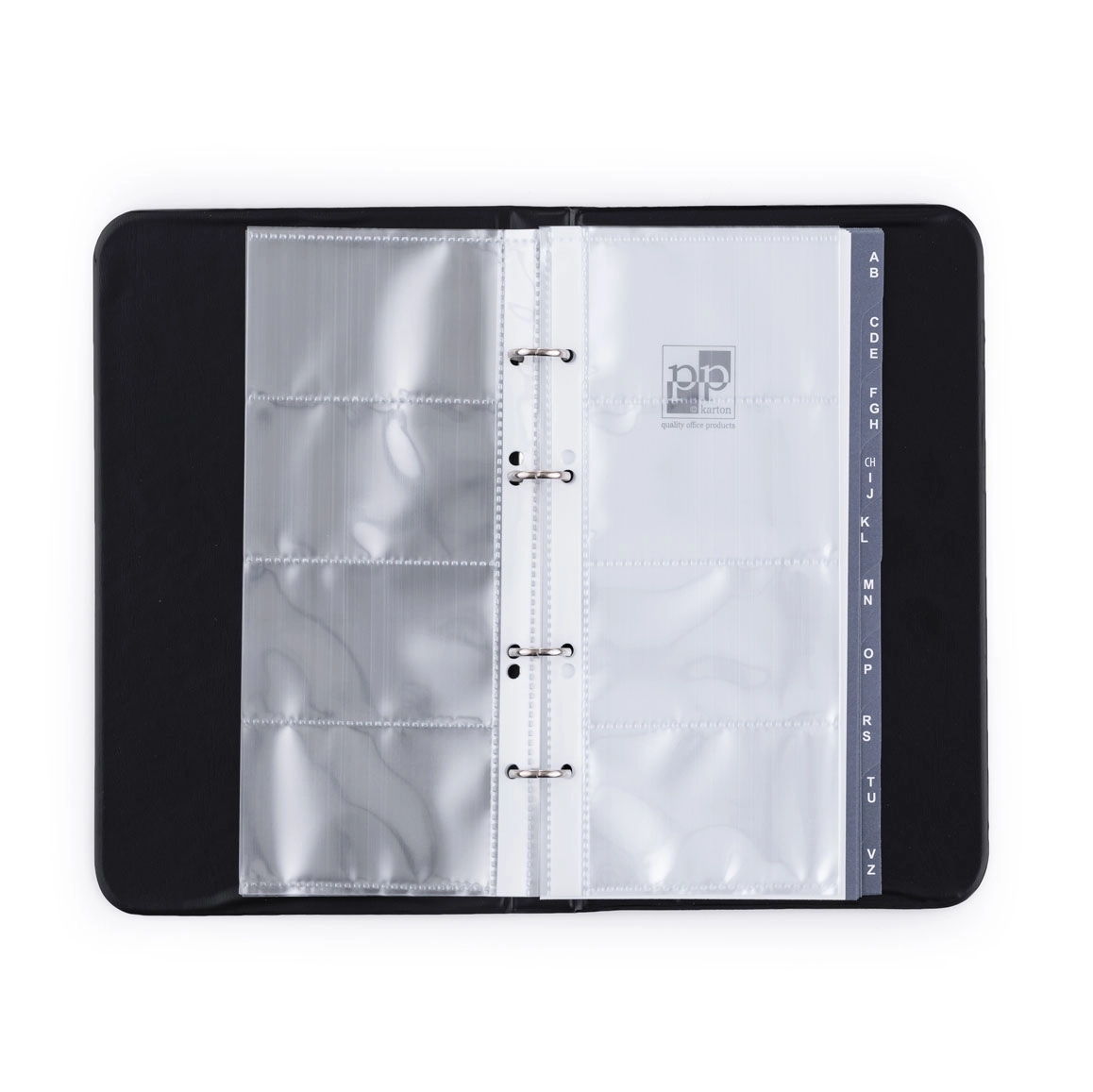 Keep your business contacts perfectly organized. This ring-bound card holder allows convenient adding and replacing of sheets and holds up to 80 standard business cards. The black glossy surface provides a professional look and resists everyday wear.