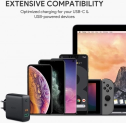 Charge your devices quickly and efficiently with the AUKEY PA-D3 charger. Two ports — USB-C Power Delivery and USB-A — cover everything from phones and headphones to more demanding devices, including laptops and USB-C powered monitors. Dynamic Detect intelligently allocates power: up to 60 W with one connected device, and optimized distribution with two devices (e.g., up to 45 W for the primary port), ensuring fast and safe charging.