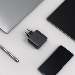 The compact AUKEY PA-D3 wall charger with dual ports (USB-C + USB-A) delivers up to 60 W for fast and safe charging. Thanks to Dynamic Detect technology, it uses full power when charging a single device, and intelligently splits power when charging two devices at once. Ideal for smartphones, tablets, and laptops, with a foldable plug for easy travel.