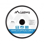 Active optical HDMI 2.0 cable LANBERG with a length of 30 m reliably carries video and audio at 4K@60 Hz without loss of quality. Thanks to the one-way connection and clear connector labeling, it ensures flawless installation. It supports HDR, 3D, ARC and CEC 2.0, features gold-plated connectors, and is resistant to EMI interference.