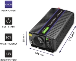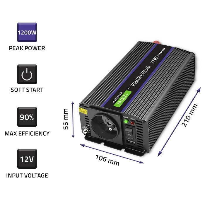 When choosing the right inverter, pay attention to the power rating and battery voltage, which must match what is specified on the inverter so your equipment has proper operating conditions. Also important is the number of connected devices; for example, when connecting a laptop and a printer you should add up the power of both devices. Remember that the consumption of the connected equipment should not exceed 85% of the inverter’s rated power.