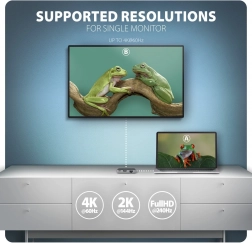 - 1x HDMI (A, female); up to 4K 4096×2160@60 Hz; 2560×1440 up to 120 Hz; 1920×1080 up to 240 Hz; requires USB-C with DisplayPort Alt Mode 1.4+ or Thunderbolt 3/4; HDR (10-bit), Hot Plug Detect, TMDS, HDCP 1.4/2.3; 2-channel audio up to 24-bit/192 kHz (depending on source and sink device)