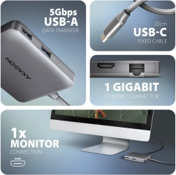 The compact AXAGON USB-C hub expands your notebook with 5 practical ports: HDMI 4K/60 Hz, Gigabit Ethernet, 2x USB-A 5 Gbps, and USB-C Power Delivery up to 100 W for pass-through charging. It supports fast 5 Gbps transfers, phone charging up to 1.5 A, gaming refresh rates up to 240 Hz in Full HD, and DP Alt Mode as well as Thunderbolt 3/4. The aluminum body ensures durability and efficient cooling.
