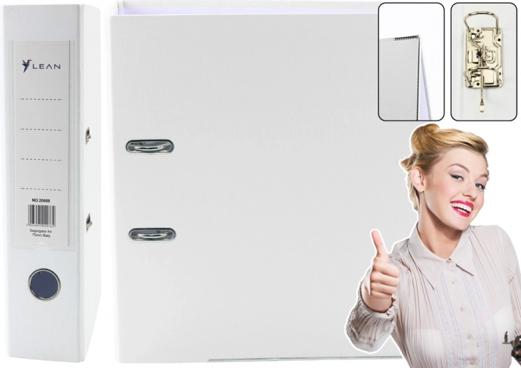Elegant document binder A4 with a broad spine of 75 mm in pure white color. Ideal for storing documents in the office, at home, or for school materials. Holds up to 500 sheets of 80g/m², which is great for archiving invoices, contracts, and other important documents.