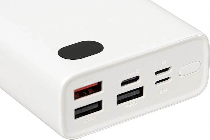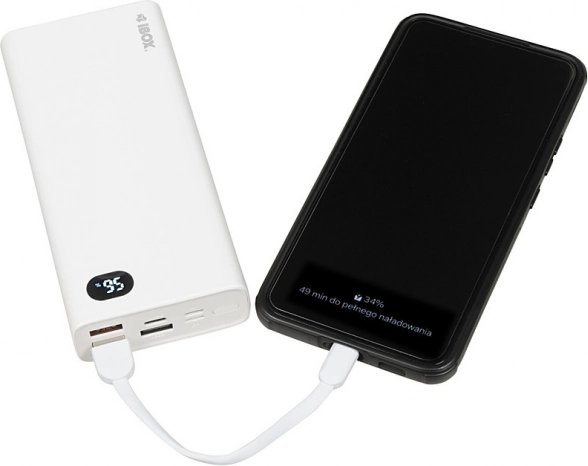 High-performance IBOX power bank with a capacity of 20,000 mAh keeps your devices running all day. It supports fast charging Power Delivery and Quick Charge, offers USB‑C and USB‑A ports, a clear LCD display, and includes a USB‑C cable in the box.