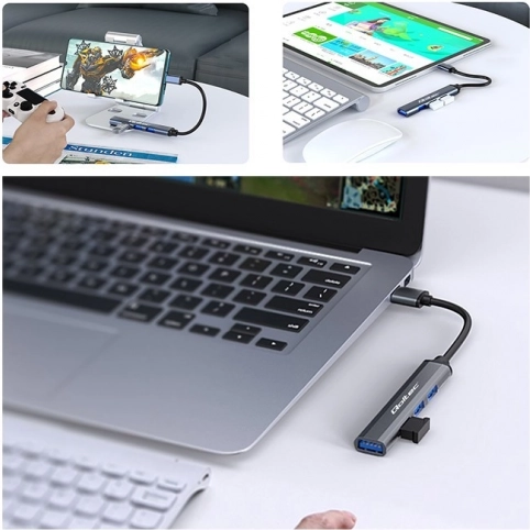 A compact 4-in-1 USB‑C hub expands your laptop or computer with extra ports for work and play. It offers 1× USB 3.0 for fast data transfer up to 5 Gb/s and 3× USB 2.0 for connecting peripherals. Thanks to the USB‑C connector and Plug & Play, it works instantly without driver installation. The sturdy aluminum body ensures durability and better heat dissipation—ideal for the office, travel, and your home workstation.