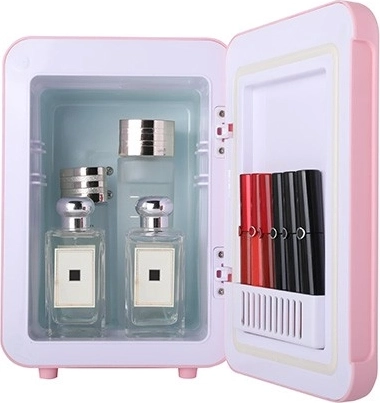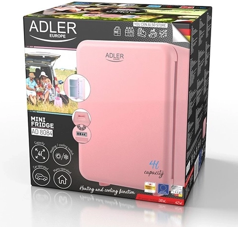 The compact ADLER 4 l mini fridge in an elegant pink color is ideal for home, office, and car. It offers cooling and heating, a portable design with a handle, and a practical interior layout with a shelf and a door basket. Thanks to Peltier technology, it keeps your drinks, snacks, cosmetics, or medicines at the optimal temperature wherever you are.