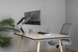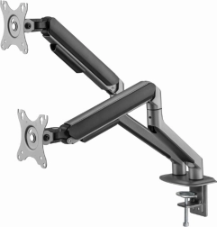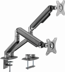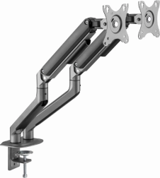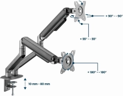 Enhance comfort and productivity with this dual monitor desk mount for 17–32" screens. It offers smooth adjustment thanks to gas springs, swivel, tilt, and pivot to portrait, secure clamp or grommet mounting, and cable management for a tidy workspace. Load capacity per monitor up to 9 kg, compatible with VESA 75 × 75 and 100 × 100.