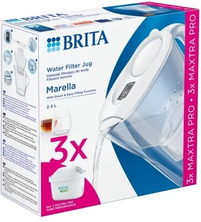 The practical BRITA Marella white filter jug ensures a steady supply of fresh filtered water for the whole family. Thanks to the MAXTRA PRO Pure Performance cartridges, it improves the taste of water, drinks, and food, reduces limescale buildup in kettles and coffee makers, and offers easy one-handed filling plus an electronic filter replacement indicator. The package includes 3 filter cartridges for long-lasting convenience and savings.