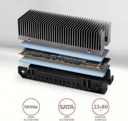 The AXAGON passive aluminum heatsink for M.2 SSD 2280 ensures efficient heat dissipation from both sides of the drive and reduces its temperature by up to 30 °C. Thanks to the compact 24 mm height, universal compatibility (single- and double-sided SSDs, SATA and NVMe), and included silicone thermal pads, it is ideal for consistent performance without thermal throttling and longer drive lifespan.