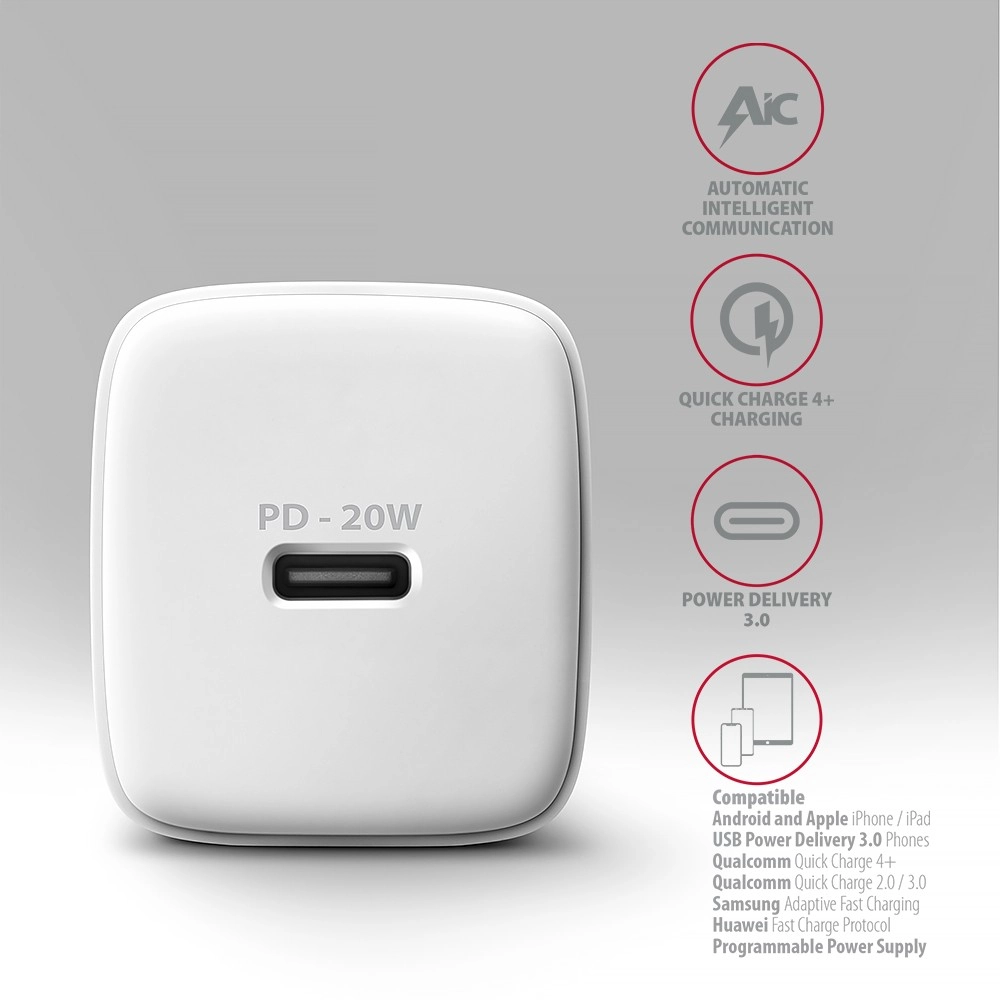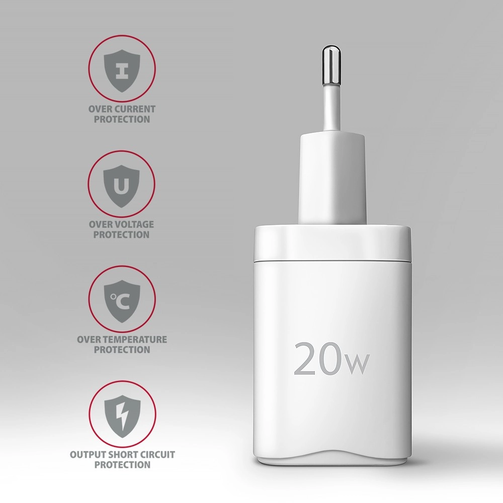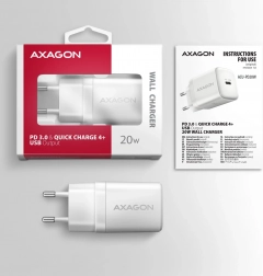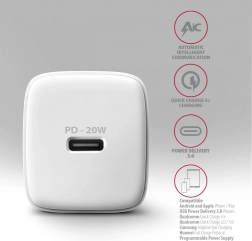 Compact wall charger AXAGON ACU-PD20W for fast charging of mobile devices. With a total output of 20 W, the charger can power phones, tablets, and other mobile devices at the highest possible speed. The adapter offers a reversible USB-C connector.