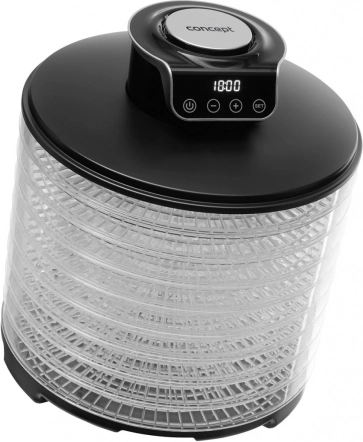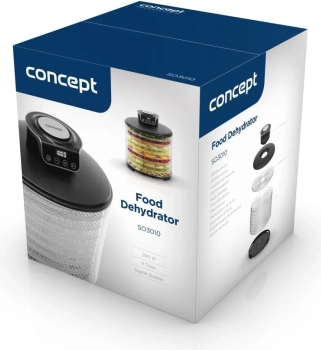 The Concept SO3010 food dehydrator comes with 9 drying trays and features an innovative design. The motor is placed in the lid, protecting it from damage during drying that could be caused by dripping juices or crumbs from dried foods.