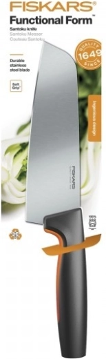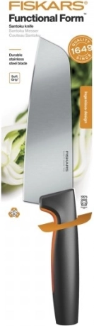 Discover a versatile Asian-style kitchen knife – a santoku with a 16 cm blade from the FISKARS Functional Form range. It features Japanese stainless steel for long-lasting sharpness, an ergonomic SoftGrip handle for a secure hold, and a safe finger guard for comfortable, safe cutting. Ideal for vegetables, meat, and herbs, it’s easy to use, clean, and is dishwasher safe.