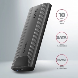 The AXAGON enclosure features a fast USB 3.2 Gen 2 interface with transfer speeds of up to 10Gb/s, support for modern functions like UASP, TRIM, and the ability to read S.M.A.R.T. information. It is suitable for various SSD card lengths - 30, 42, 60, and 80 mm.