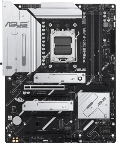 The ASUS Prime X870-P WiFi motherboard unlocks the full performance of AMD Ryzen processors for the AM5 socket. It offers stable power delivery with a robust VRM, comprehensive cooling with integrated heatsinks, and smart tuning tools for easy optimization. Includes support for DDR5 and modern connectivity such as Wi‑Fi, HDMI, and USB‑C — ready for demanding applications and PCs with advanced AI features.