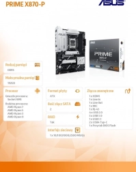 ASUS PRIME X870-P is a reliable foundation for high‑performance builds on the AMD AM5 platform. Thanks to a robust power stage, quality heatsinks, and a well‑thought‑out slot layout, it delivers stability under load while leaving room for future expansion. Intuitive tools in the UEFI and software allow easy setup, tuning, and system monitoring.