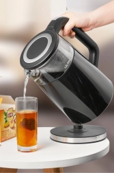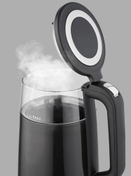 The kettle’s housing is made of plastic, while the interior is made of high-quality borosilicate glass, ensuring durability and easy cleaning.