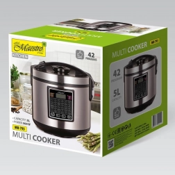 Maestro MR-793 Multicooker is a versatile kitchen appliance that, thanks to its 5-liter bowl and 900 W power, allows you to prepare a wide range of dishes. The body, made of durable stainless steel and plastic, provides durability and a modern look. The multicooker offers up to 42 programs for cooking, frying, and baking, making it ideal for everyday culinary challenges.