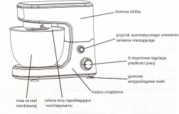 Additional features include automatic stop when the head is lifted, mixer lock, and sturdy rubber feet for stability. Safety lock and overheating protection ensure the device's long lifespan. The cable is 105 cm, the device measures 13.5 cm in width, 28 cm in height, and 28.5 cm in length, with a weight of 5.25 kg.