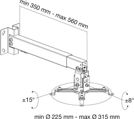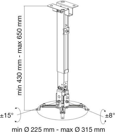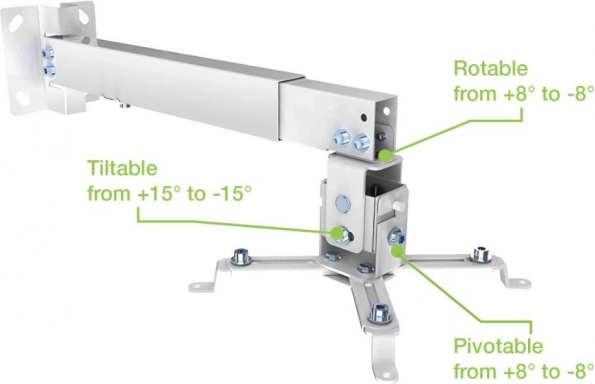 The Techly mount allows precise adjustments with a tilt of ±15° and a horizontal rotation of ±8°, providing flexibility in image setting. Made from durable steel, it ensures the device's stability and long lifespan. Four adjustable mounting arms ensure compatibility with many projectors. The integrated cable management system guarantees an aesthetic appearance.