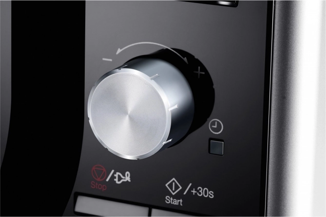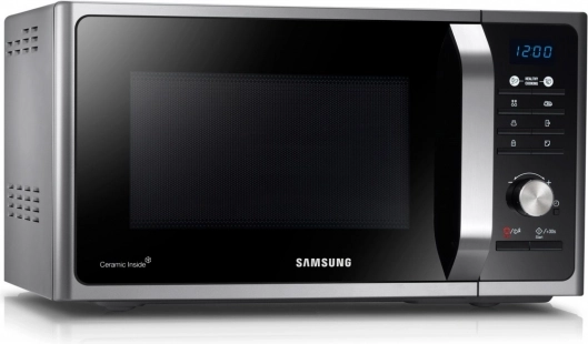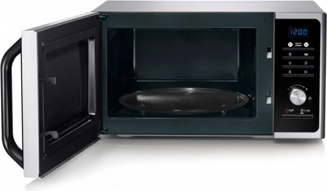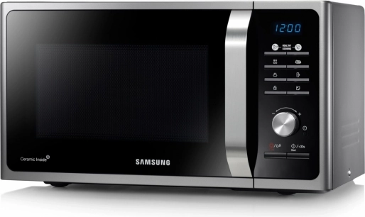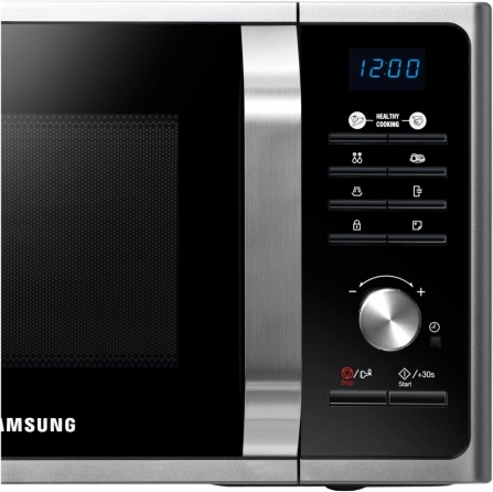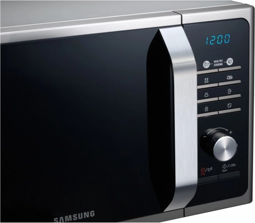 With this Samsung microwave, you can enjoy healthy cooking and fast defrosting, with each dish being perfectly prepared. Its elegant black glass combined with metal construction and intuitive control panel with digital display makes this appliance both an aesthetic and functional addition to your kitchen.