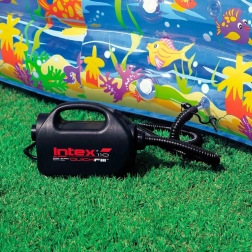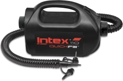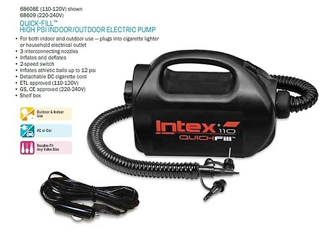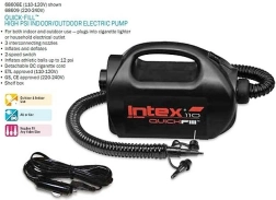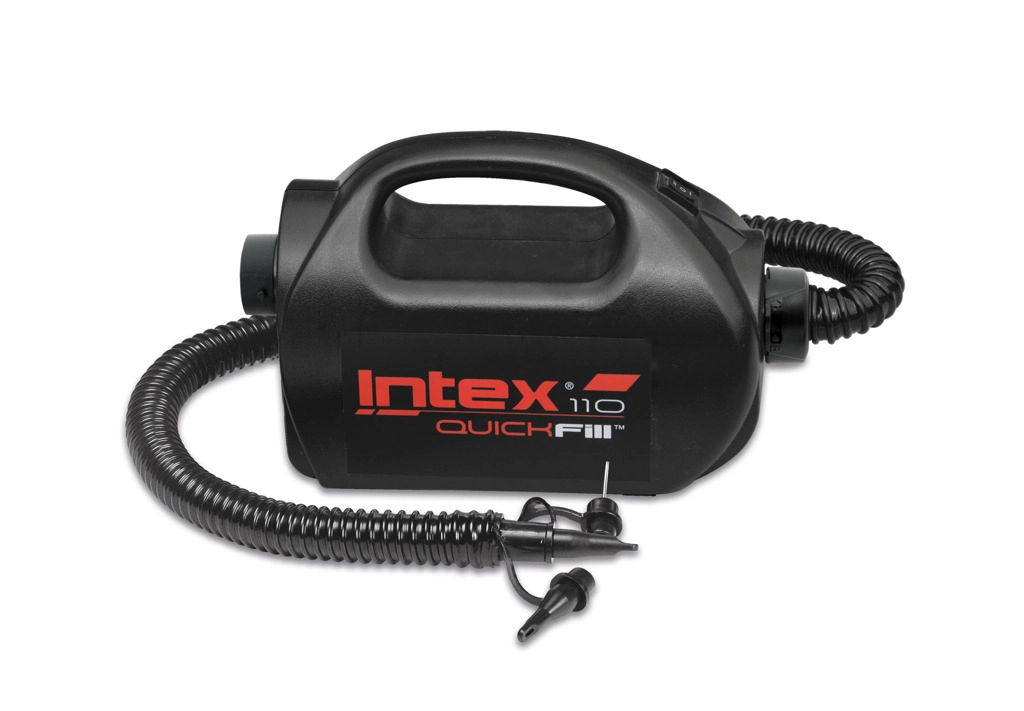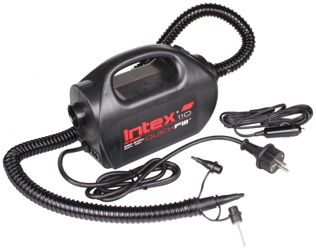 The versatile Intex Quick-Fill electric pump speeds up the setup of air mattresses, pools, boats, and other inflatables. Dual 12 V/230 V power lets you use the pump at home or in the car on vacation or while camping. The compact body with a practical handle and flexible hose makes handling easy.