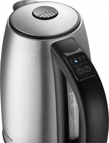 The elegant stainless steel Concept kettle with a 1.7 L capacity offers four-step temperature control 70–100 °C, convenient digital controls on the handle, and a practical Keep Warm function. Thanks to the quality STRIX system, triple safety protection, and a concealed heating element, boiling water is fast, safe, and maintenance is exceptionally easy.