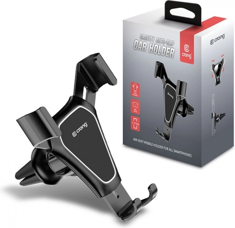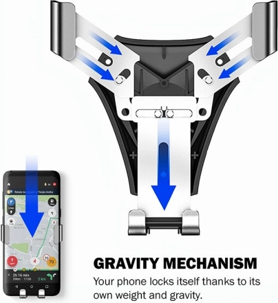 Enjoy safe and convenient phone use while driving. The gravity mechanism locks using the phone’s own weight, so the device stays secure even on uneven roads. The holder mounts to the air vent grille and, thanks to the rubberized clip, won’t damage the fins.