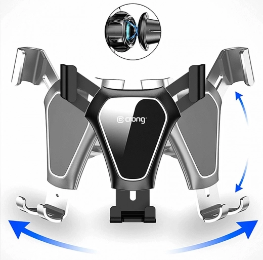 Practical gravity car holder for smartphones sized 4.7–6.5" with attachment to the air vent grille. Thanks to the automatic gravity locking, the phone securely locks itself in place after insertion. Non-slip inserts reduce vibrations, the rotating head lets you set the ideal angle, and there is support for using the phone in a case up to 15 mm thick.